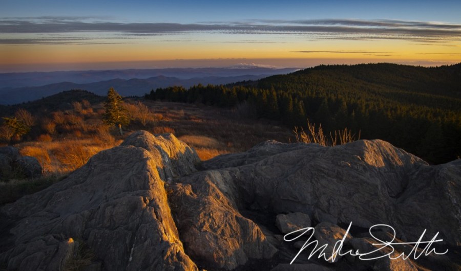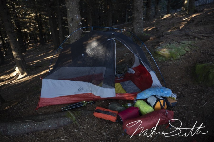 The balds with intermittent fog racing across we’re a surreal beautiful place. As more and more low clouds cleared only high cirrus clouds renamed the kind that makes amazing sunsets. It would be nice if I could camp up here. Maybe on the leeward side behind some tall blueberry bushes, the wind just kept getting stronger as the sun kept dropping. There was a place behind a few blueberries but this wind was too fierce for this the tent kept collapsing. I must move back below the tee line. I must compromise between getting camp set up and photographing the potentially amazing sunset.