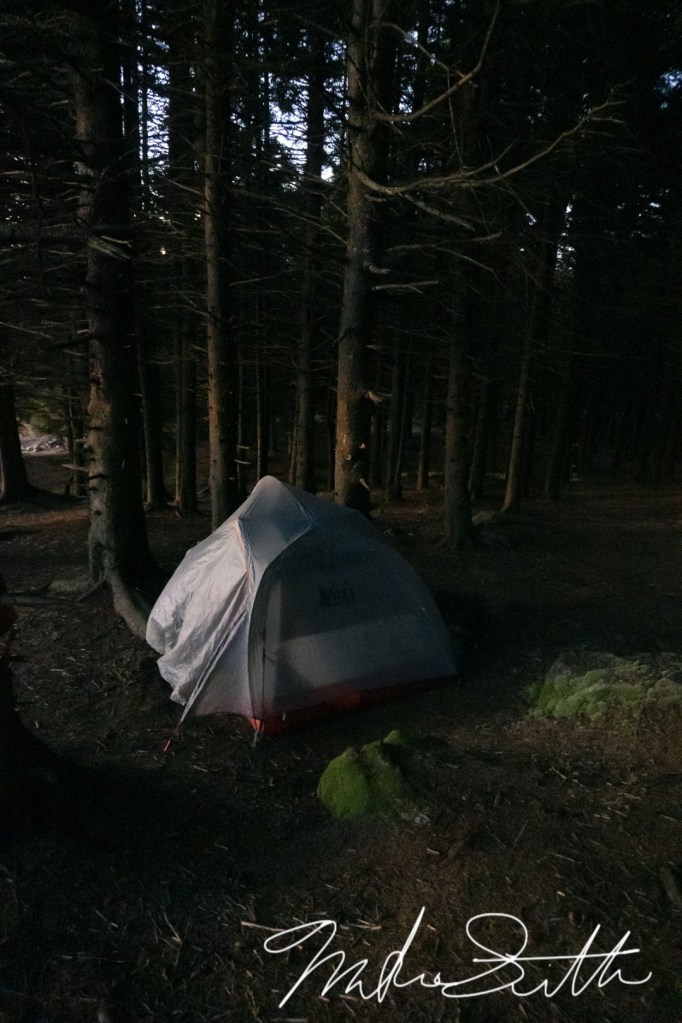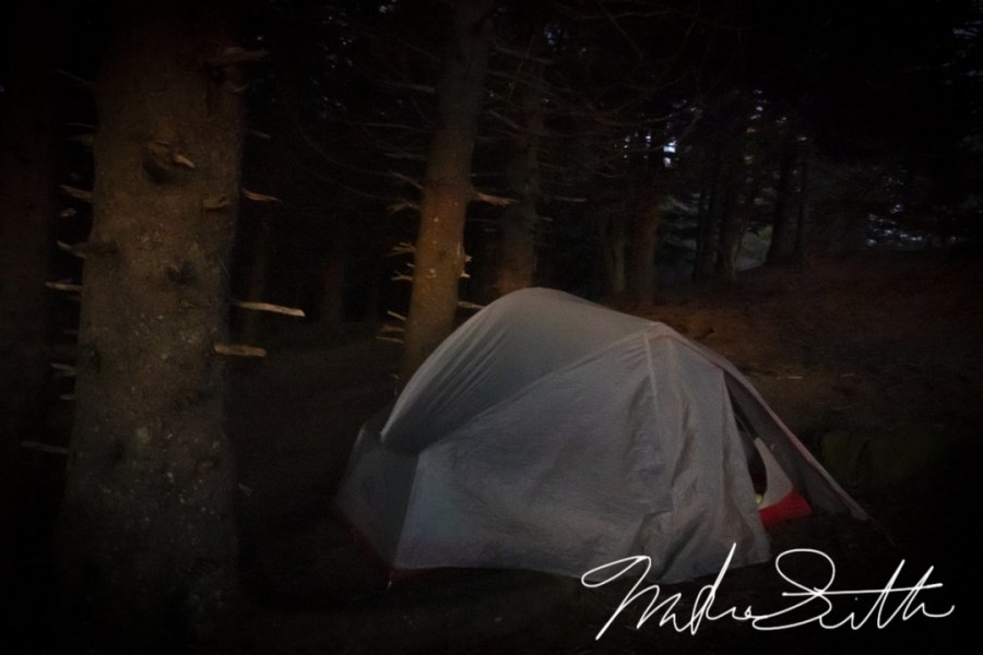 I had spotted a perfect place on the way up. A level place opening to the east for a sunrise view. I had seen no one all afternoon so it took me by surprise that the campsite I had hoped for was taken. So, in the darkness of the trees, I began to look around for a level place that would still be high enough to hopefully get a few pictures of the sunrise the next morning. My tent is not much more than 6X3 so it would not take much. A good thing too because I did not find much. A small ledge between the roots and rocks still with a good downhill grade (drainage) but I can make this work.