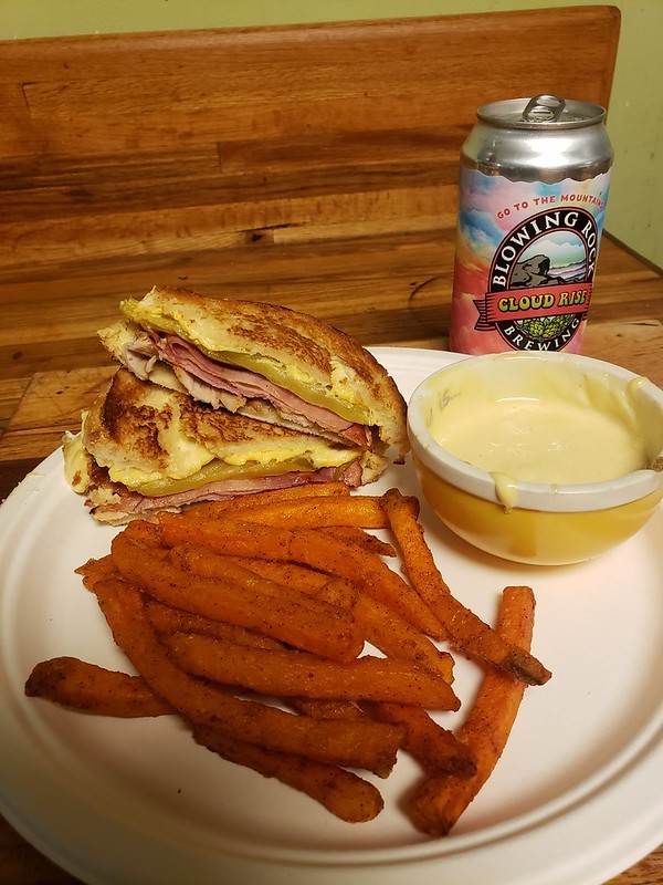 What do you do when when you have left a over pork chop? You make a Cuban or in my case an almost Cuban. Porkchop sliced very thin, deli ham, bread and butter pickel slices, american cheese, a spicy mustard mayo sauce. Served with chipotle sweet potato fries and my award winning homemade honey mustard. On a side note since it is almost a Cuban I thought of calling it Ernest Hemingway, but I looked that one up. A Ernest Hemingway is a peanut butter and raw onion sandwich? Hey I have not tried will not knock it yet.