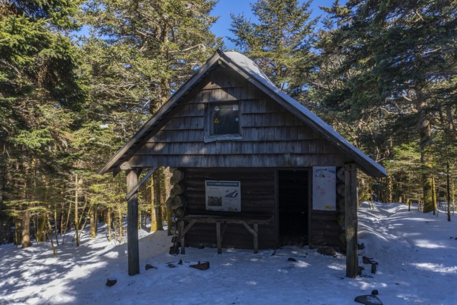 I was out very quickly but then at around 1:00 am I heard the door downstairs open I peeked down and it looked like four or five guys and a lady coming in off the ski slopes they were pretty loud but I have learned from sleeping in shelters bring ear plugs I put them in and was back out till about 4am when all the heat from the fireplace rose and it felt like it was over 90 degrees in this room I found a small fan that helped, by daybreak the skiers were gone. A shower invigorated and prepared for a new day! Finding breakfast in this town was a challenge we ended up driving to the next town over. where we found and adorable café Kaye’s Kitchen in Newland, NC. It sat beside a beautiful river park with paths, arch bridges and very cute ducks huddled in the cold. After an amazing breakfast we headed back up the mountain to explore the other side. Most all of this hike was in the spruce fir forest and it had a beauty all its own. It did not need the scenic vistas the bald afforded. As we neared the top, we hiked up to the highest shelter on the AT a beautiful log cabin with a loft nestled quietly in the snow.
