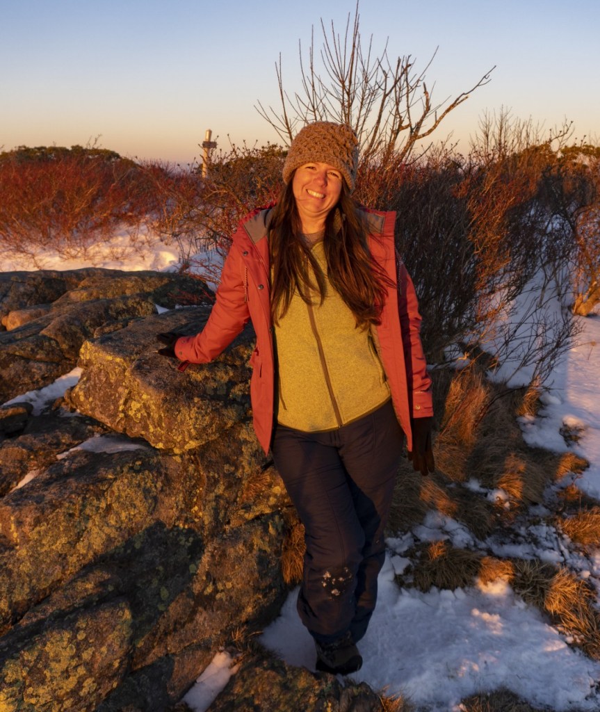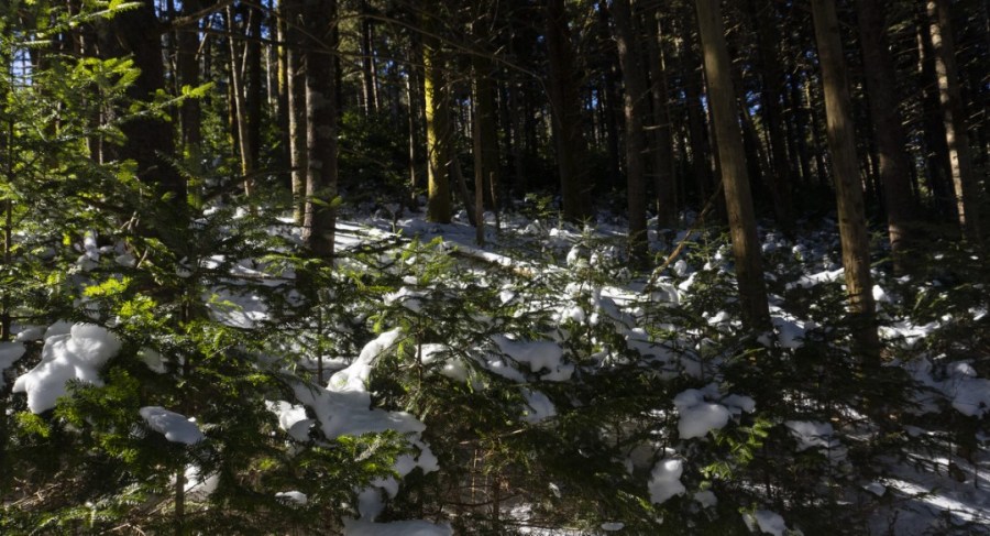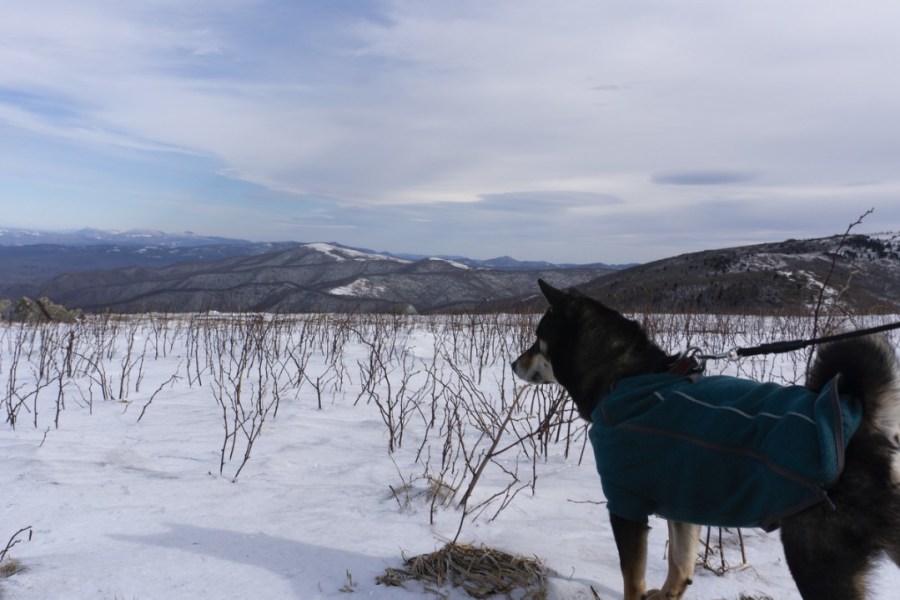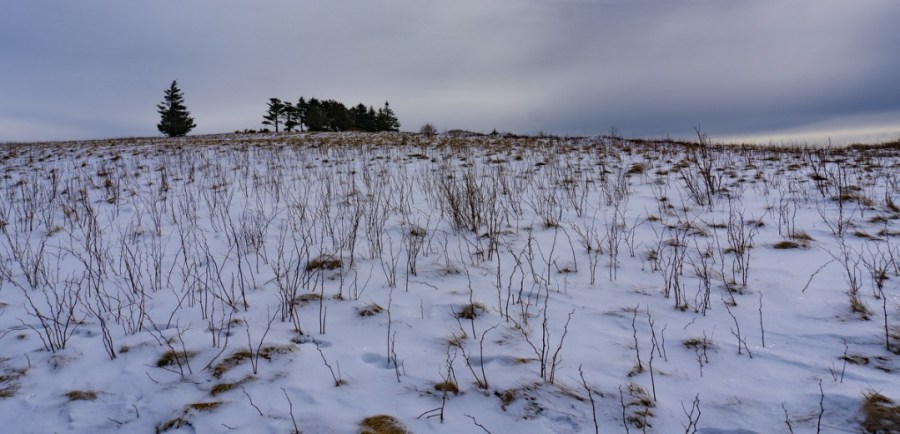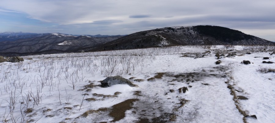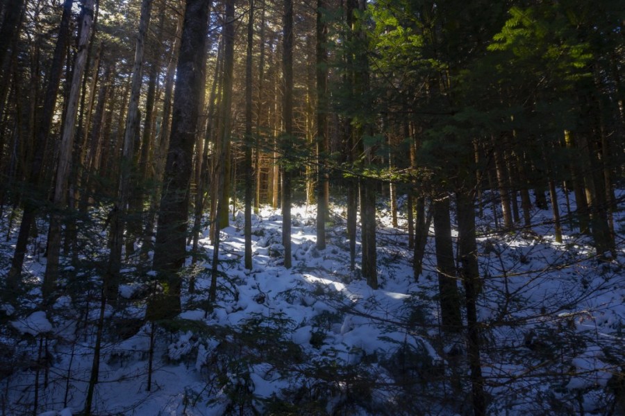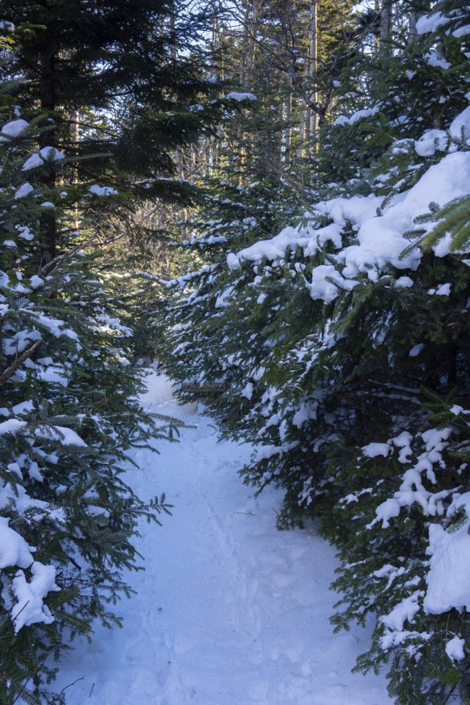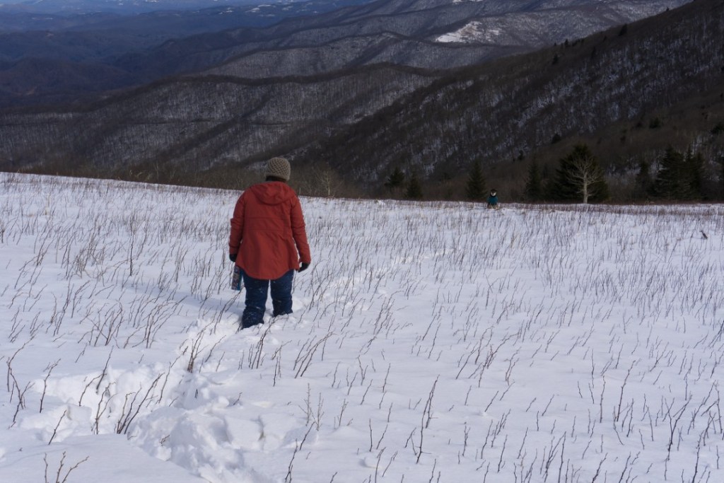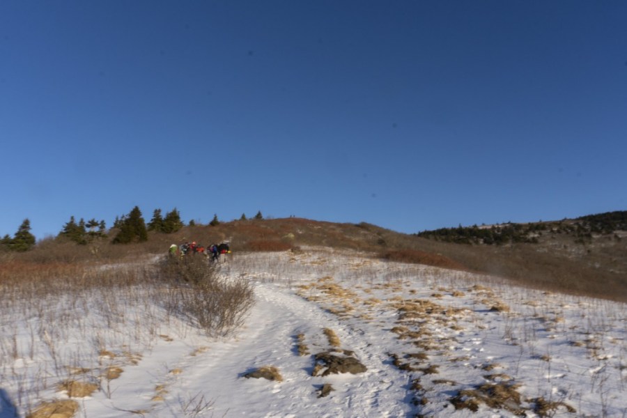 All bundled up we headed up thru the spruces and firs opening up to the first bald.