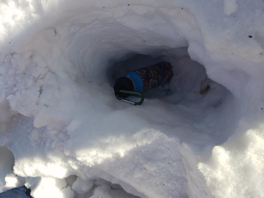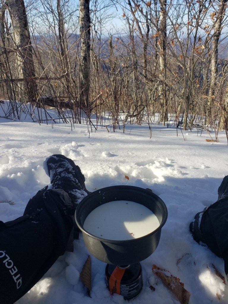 We decided to turn back, not before having a snow picnic. I made some of the best salted caramel hot chocolate with real milk (yes, it was worth carrying a cook set just for this!) along some trail mix with espresso beans, Mmm. I had an orange also but it was pretty much frozen!