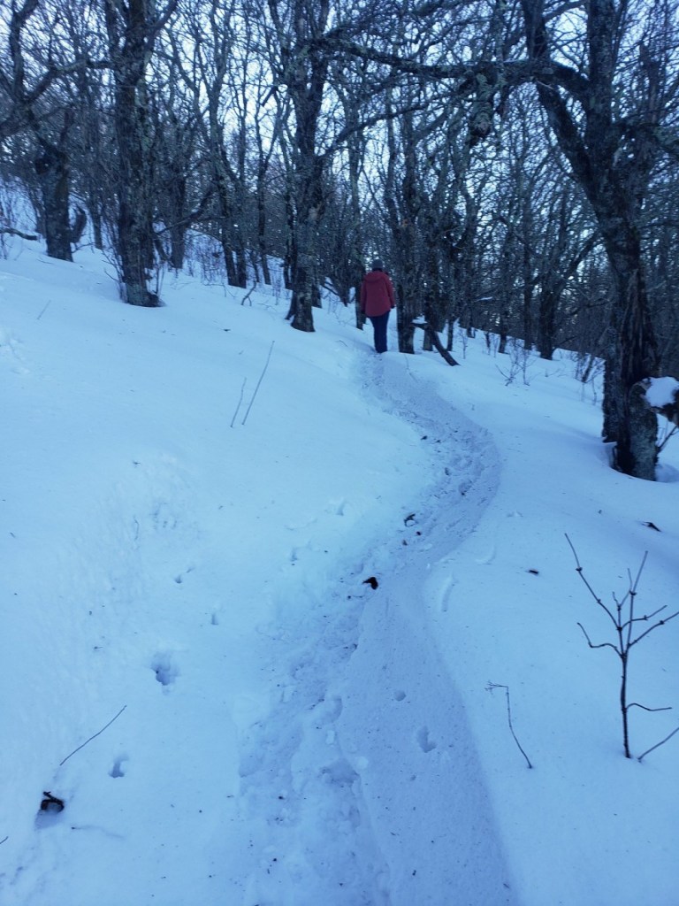 after a bit more hiking, we had another snow picnic in a field of deep snow that had thawed on top then refroze with a half of a inch crust of ice so you could almost walk on it but not quite each step breaking through with a resounding thud! As we walked across, I told Emily that it reminded me of scenes on National geographic episode actually this whole trip could have been made into a National geographic episode it has been that epic! The whole top of this side of the mountain had one to two foot of snow with much higher drifts. a lot of it was a fine powder that the cross-country skiers loved. Right before leaving we met two nice guys from Tennessee that we ended up walking back off the mountain down the road with. The road had been packed down by skiers so it made for a very easy walk off.