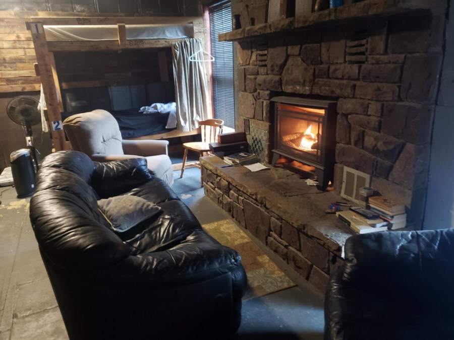 We soon found out it was going to be karaoke night and the place was packed with people and they were still filing in seemed like the whole town was here. The wings were outstanding! Super friendly people! Several people introduced their self’s. Even more wanted to pet Savannah. The one pool table in back had it own crowd with the most people surrounding it. It was a place you just felt comfortable in. The karaoke started, the first girl that sung was amazing but others were not so much. This helped make mine and Emily’s decision to try a few songs. Emily went first with a beautiful rendition of a Carly Simon song. She has a beautiful voice and as I sat there watching and listening to her sing my eyes scanned the room all eyes were on her as the colored lights illuminated their faces. It was one of those moments that you will remember forever, maybe even write stories about!. I noticed most everyone else were all drinking beer I thought about ordering one, most of my life I would have but, in this moment, I knew alcohol would diminish. I discovered I do not need alcohol to have fun in a bar or even to have courage to sing in front of a crowd! When it was my turn, I chose David Alan Coe “You never even call me by name” Because Me and Ali have closed so many nights with it, that I almost know the lyrics by heart. I started out very nervous but then I noticed no one was throwing fruit or even booing I started to have fun. Later on, Emily crushed Fleetwood Macs “Landslide” and I followed with Lynyrd Skynyrd’s “Give me three steps” by then I had loosened up enough to dance and have fun with the crowd. We were very tired from our almost nine-mile snow hike and called it a night pretty early. The hostel itself was almost like a club house for adults, down stairs in the center of the room a very wore out sofa facing a grand fire place with a gas log in it.
