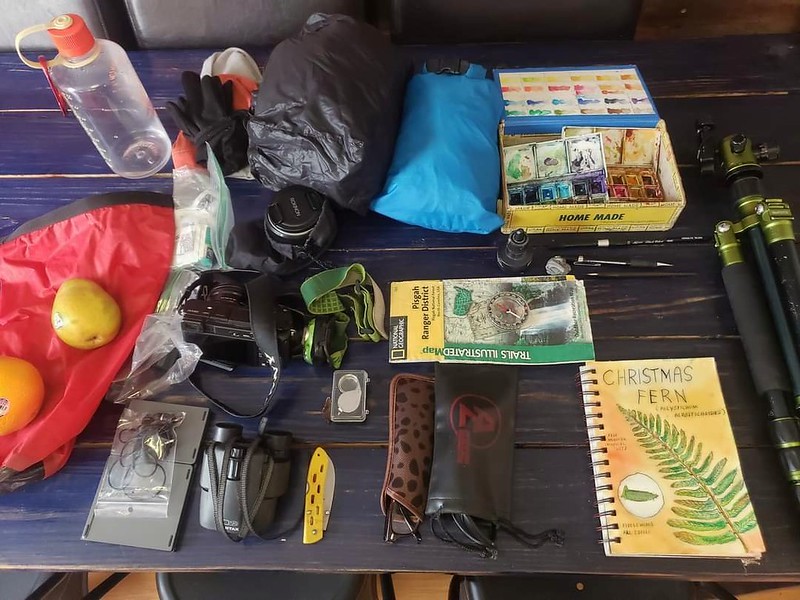 Water bottle, Packable puffy, rain jacket, beanie, gloves, buffCamera, wide-angle lens, spare batteries, tripod Map, compass (I use digital maps mostly now but like to have a paper back up) Knife, lens wipes, earbuds, foldable keyboard, headlamp reading glasses, sunglasses, binoculars, jewelers loupe (for close examination)