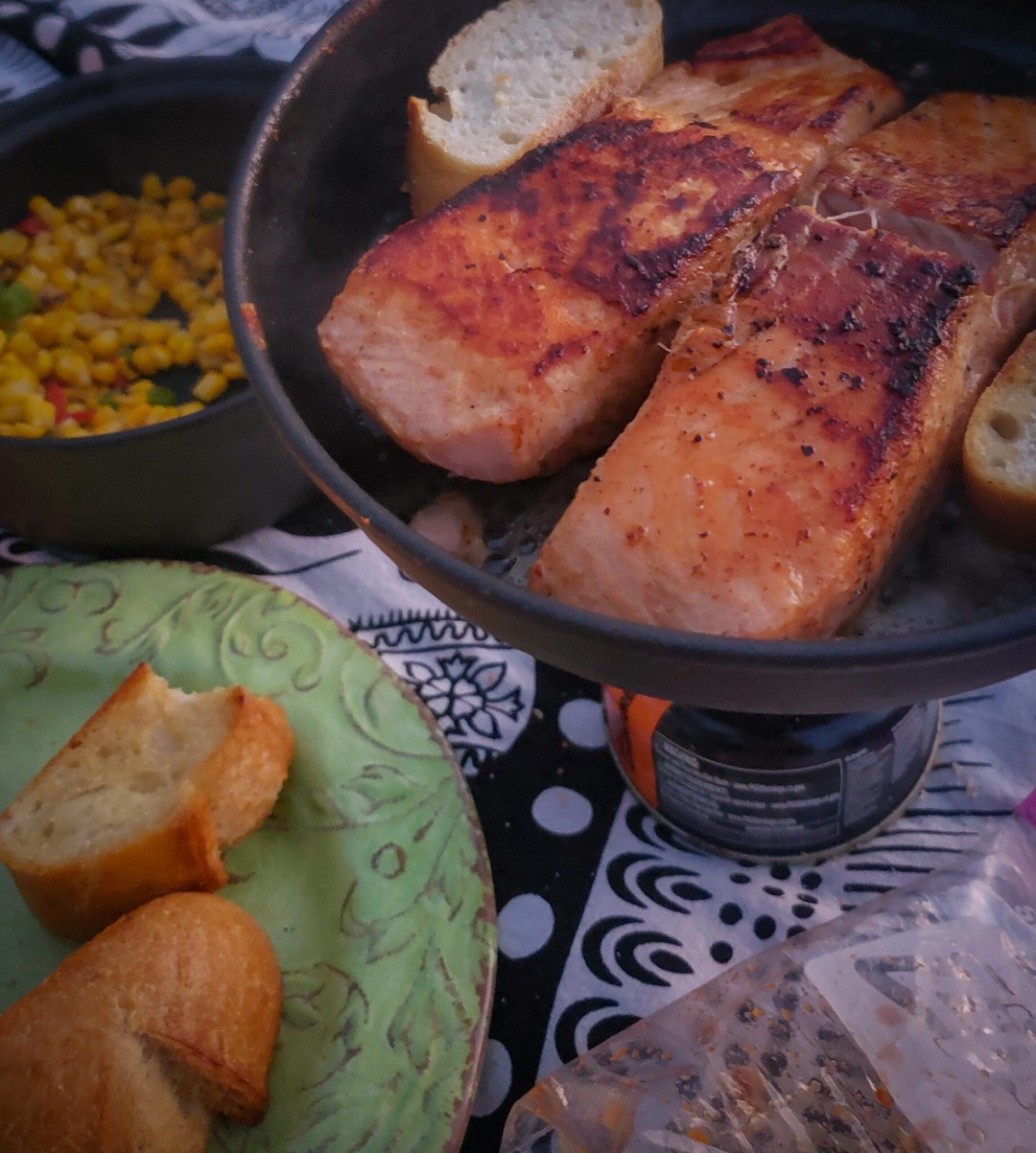 And then I fried up some amazing bourbon salmon, honey corn, with peppers, a small baguette toasted with butter. Mmmmm! Eating by candlelight as the stars came out.