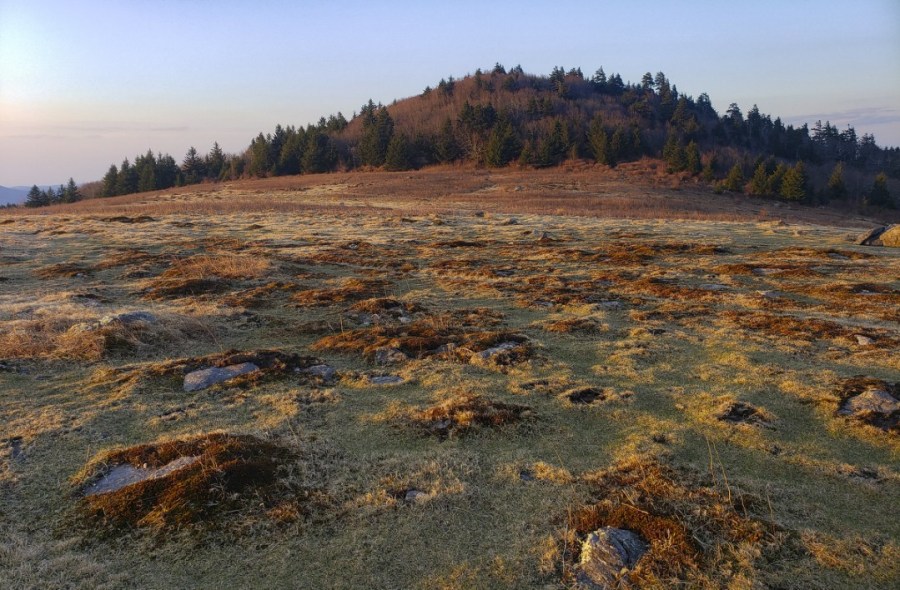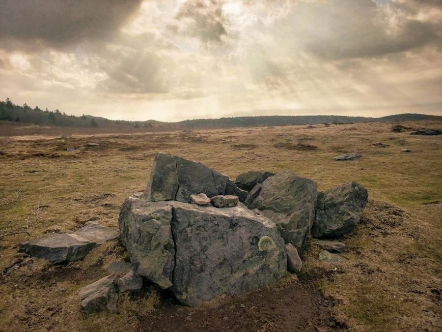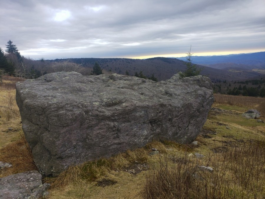 We were ready to explore a world transformed by dawn, we came out of our sanctuary tucked in the tree line and onto the bald that we had eaten on last night. The sun’s golden rays, a Quinacridone Gold now spilling across this unworldly bald, illuminating the nooks and crannies of the large rocks mingling with the curious mounds of moss giving birth basket ball sized rocks