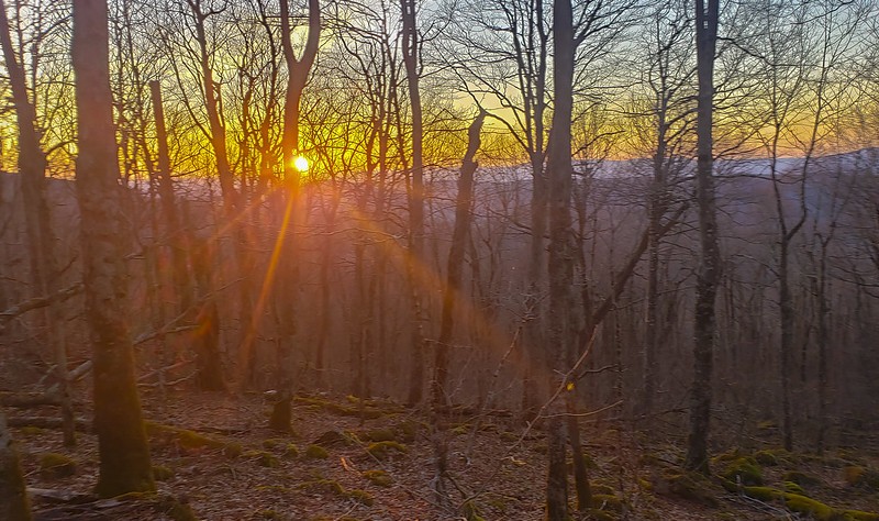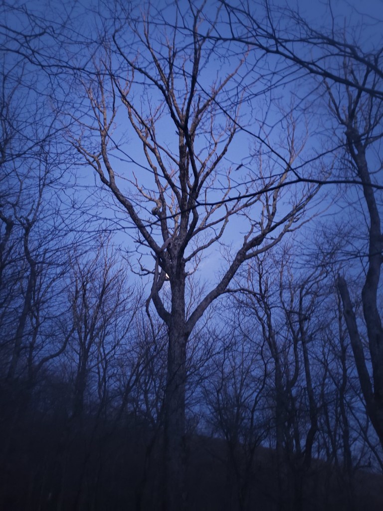 The horizon was chewing on the day and the tentacles of darkness were overtaking the remains, as we headed deeper into the forest. The still naked branches of the forest trees became dancing silhouettes in the moonlight. The trail varied from a smooth gentle path to extreme rocks. At one point it seemed as if a very angry god had grown tired of placing rocks and had dumped all the leftover rocks of the world here. Even with the rock obstacle course we had clicked thru the miles this evening. The world is so different at night peaceful but sometimes a little scary. At one point on our uphill journey wading through underbrush about knee deep, wet leaves brushing our legs as we walked. Emily was about two feet in front of me, Savannah on a leash in front of her. We were chatting about the details of life solving the universe problems. when all of the sudden a rustle in the night? It was up in front of us where Savanna was. She lunged, the leash went tight, barking growling! Bewildered and suprised Emily let out a scream! Not knowing what was going on I screamed also, hoping to scare our attacker off! (I hope it was more of a loud primal growl to scare off man or beast) After a second Emily turns to me with a look that says. What are YOU screaming/growling at? It was merely a mouse or some other small unseen creature, after a good hard laugh we continued on up the mountain.