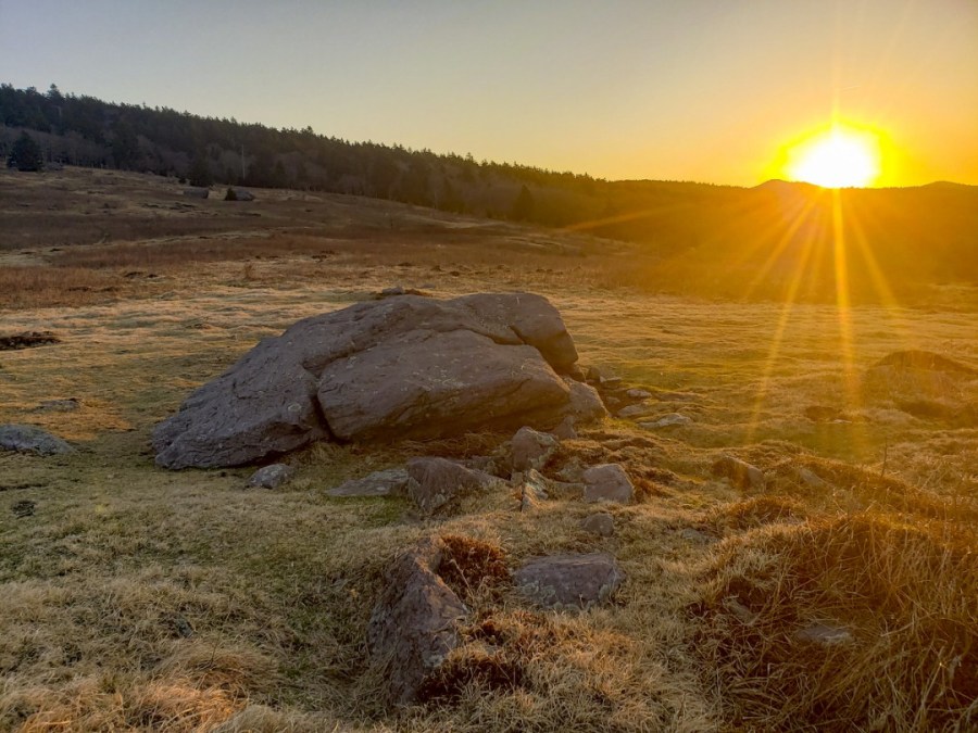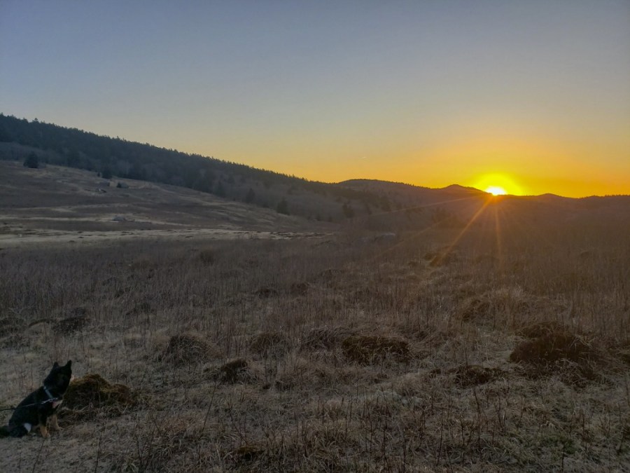 As we make our way past the threshold of the forest and onto a bald . A reverent wind swirls around, caressing the skin causing hairs to stand on end, as we enter the cathedral of the midnight pony. The moon with its soft innocent face illuminating the charcoal night with a graceful ease. Before us a panorama of an electric blue, grassy dell, right out of a western movie appears before our eyes. A feeling of awe and splendor rips thru my heart. We had entered a new church, the church of the wild and spectacular. And for the altar of this new wild church, two grand rocks each the size of moving trucks almost perfectly rectangular. They Stood high up on one side overlooking the valley just as Pride rock in the movie Lion King. We climbed up to make our offerings and to receive our sacraments. Which is code for we ate our dinner before finding camp. While the sentinels of the night, pillars of rock standing sentry to a herd of 5 wild pony’s grazing around us. As we hike past the herd the stallion that was standing guard several feet away from the herd decided we should have a escort to go by his family. he came towards us with a very authoritative look. I spoke calmly and gently to him and he let us pass but if we stopped to look back, he would move forward just enough to let know, to keep stepping! We decided to find camp along the tree line. Our goal was to find a spot were we could still see the sunrise over our valley. After a few tries, walking into dead-ends we find the perfect spot. It was almost 11:30 before we got camp set up. It was a long day but WOW! After hours of tossing and turning (I never seem to sleep well the first night on the trail) the best sleep comes with dawn.