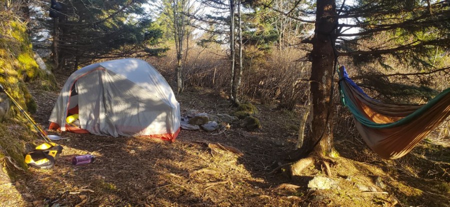 The “who cooks for you, who for cooks for y’all ” call of the barred owl had given way to a melodious reveille from a mocking bird directly over my tent. Today’s tune a very catchy “pretty bird, pretty bird.” After he is joined with the rest of the band, I reluctantly roll over and peek out the door of the tent. The eastern sky’s darkness stained with tangerine, tell me I can afford just a few more moments in this cozy bag. Eventually, in the battle of warm sleeping bag vs sunrise pictures, the promise pictures are victorious. As I made my way out of the tent Emily stretched and yawned also and climbed out of her hammock.
