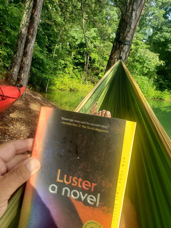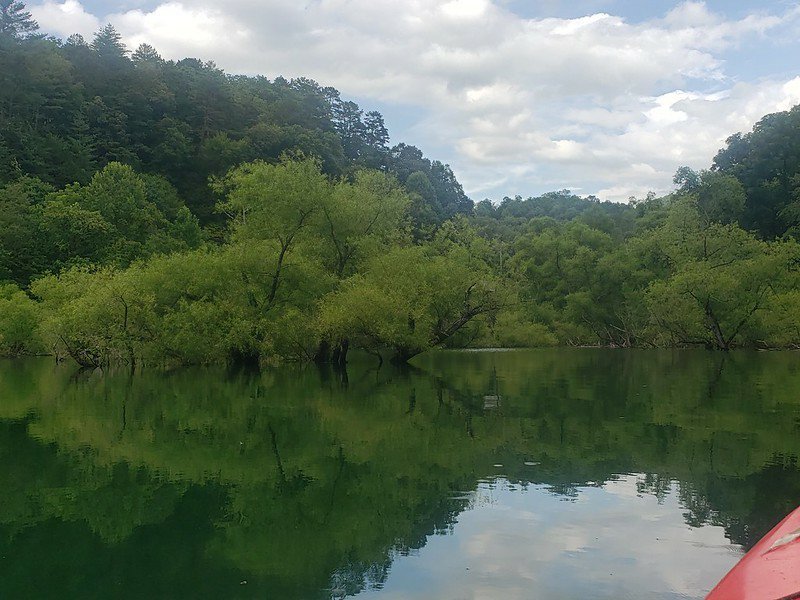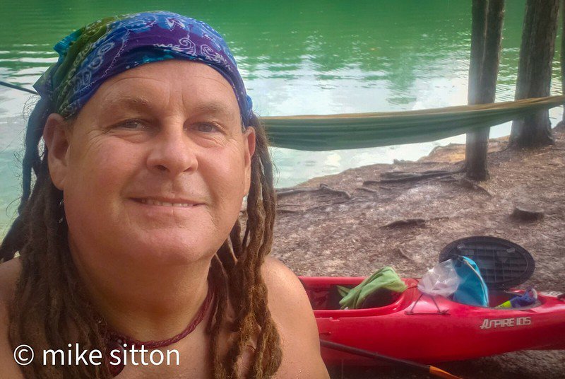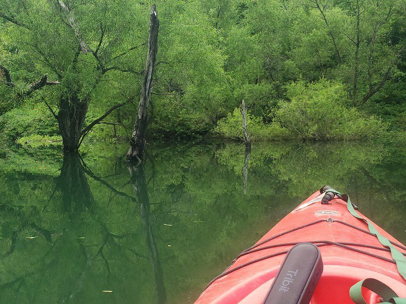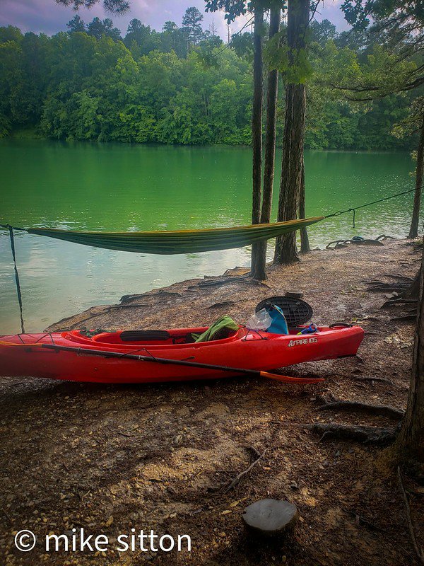 I got to explore swampy groove at the end. But I could not find a way out. Only a bridge separated it from the main lake. It look like it was connected on the map and driving by but it was not. So I paddled in what I know now was finger lake. Still had a blast. I even had one of the most amazing swims ever. I had swam around the cove for awhile getting ready to get out when I seen hard rain headed my way I did not hear thunder so I decided to wait it out instead of trying to make to the car. I sunk down till only my eyes and the top of my head were exposed. The sky grew even darker. A fog sat in. The drops splatted at first but soon it was like popcorn exploding on a snare drum. The lake danced before my eyes. For a while floated on my back allowing the drops to sting my belly then dove deep coming back to where on my eyes were exposed. I was in heaven. After about 15 minutes it was over as fast as it began. I seen blue sky behind a rainbow digging into the fog.After the rain I sat my hammock up and read for a bit then swam more.