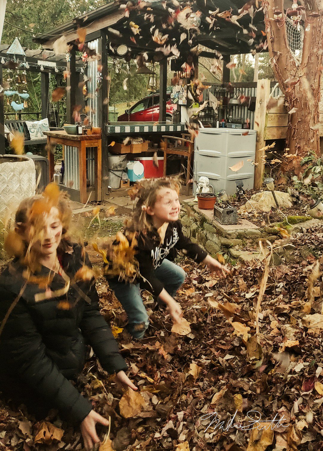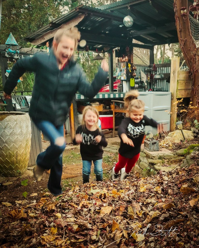 A few days ago Evie helped me get up the leaves in the garden. I would have just gone ahead and carried them behind the house but she insisted on bagging and carrying them to the front corner so her sisters could all jump in them. When we got back from the tree hunt this is what they did. It was pure joy as they dove into the leaves, tossed leaves in the air, and shouted with glee!!!