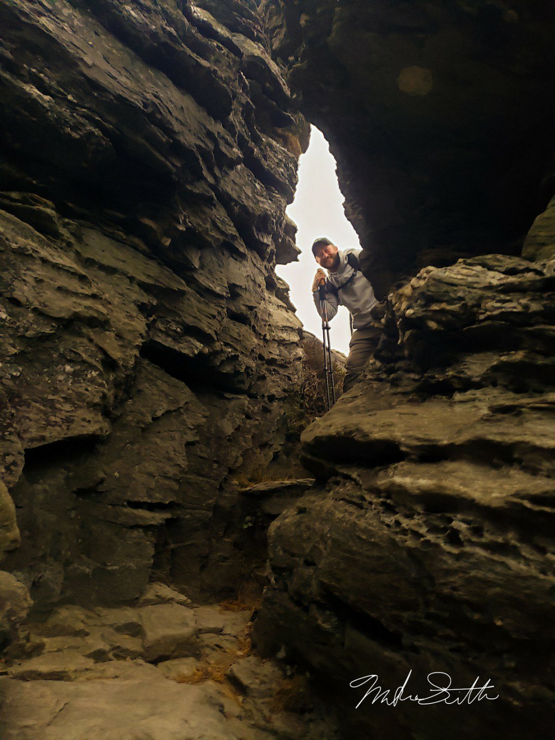 I tried to leave with a route that did not involve the belly crawl. But it took hugging a wall while crossing a ten inch ledge around the bend for about twenty feet. Then I got to where the path was, only to find out that I would have had about a seven foot climb with no good hand holds to get up to it. Looking down fifty feet to the next ledge I decided to scratch that idea and go back for another belly crawl lol