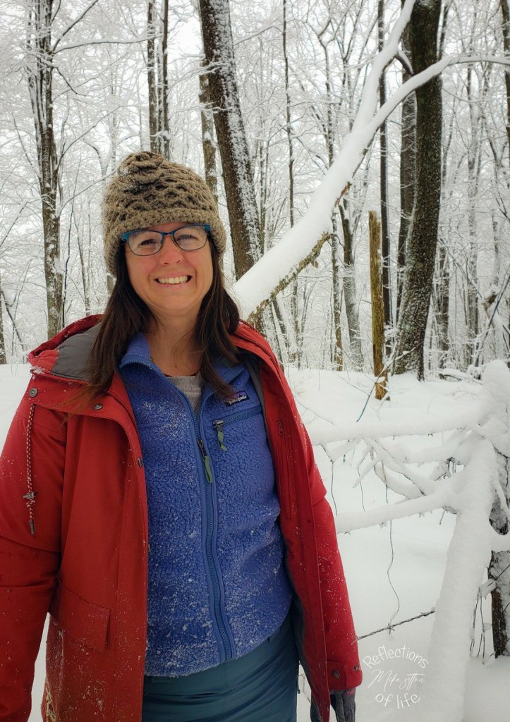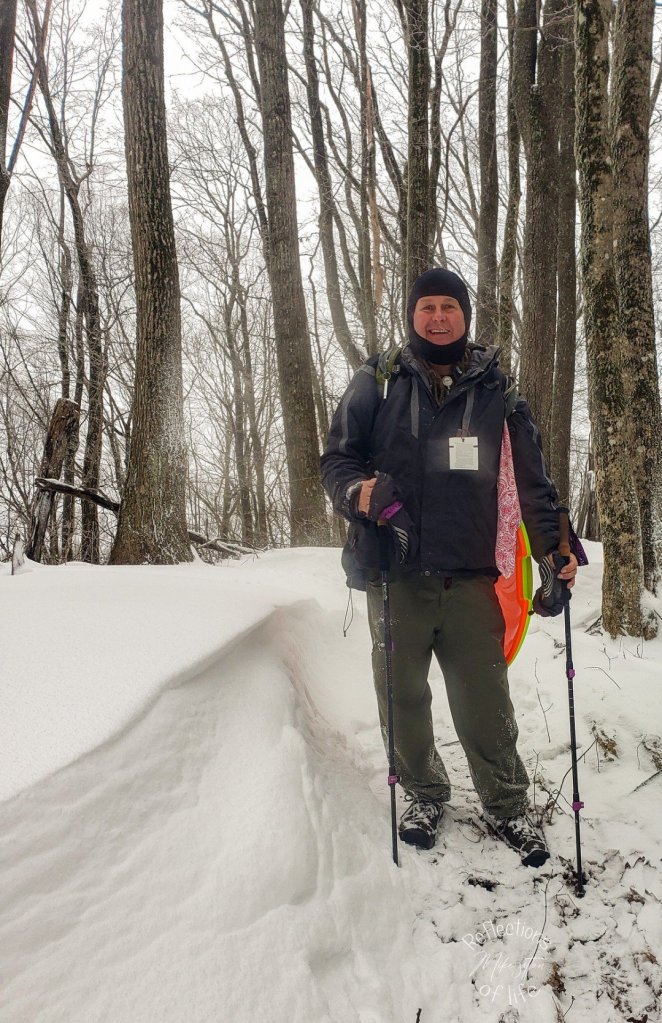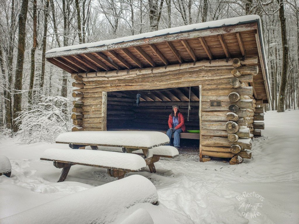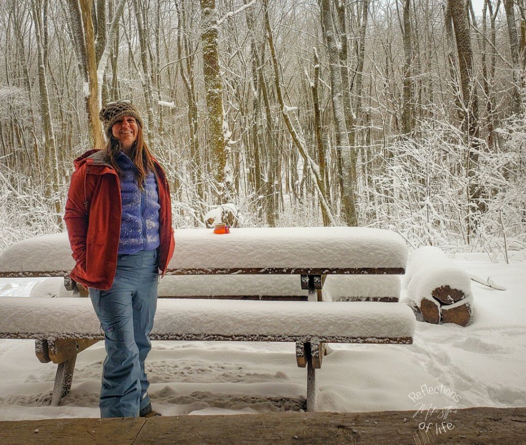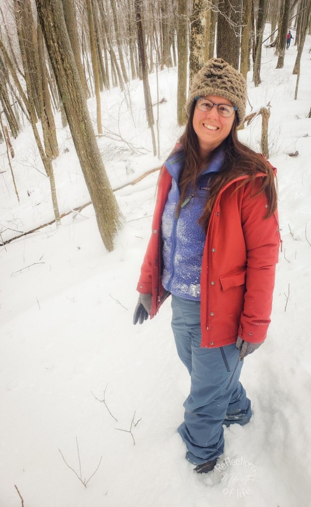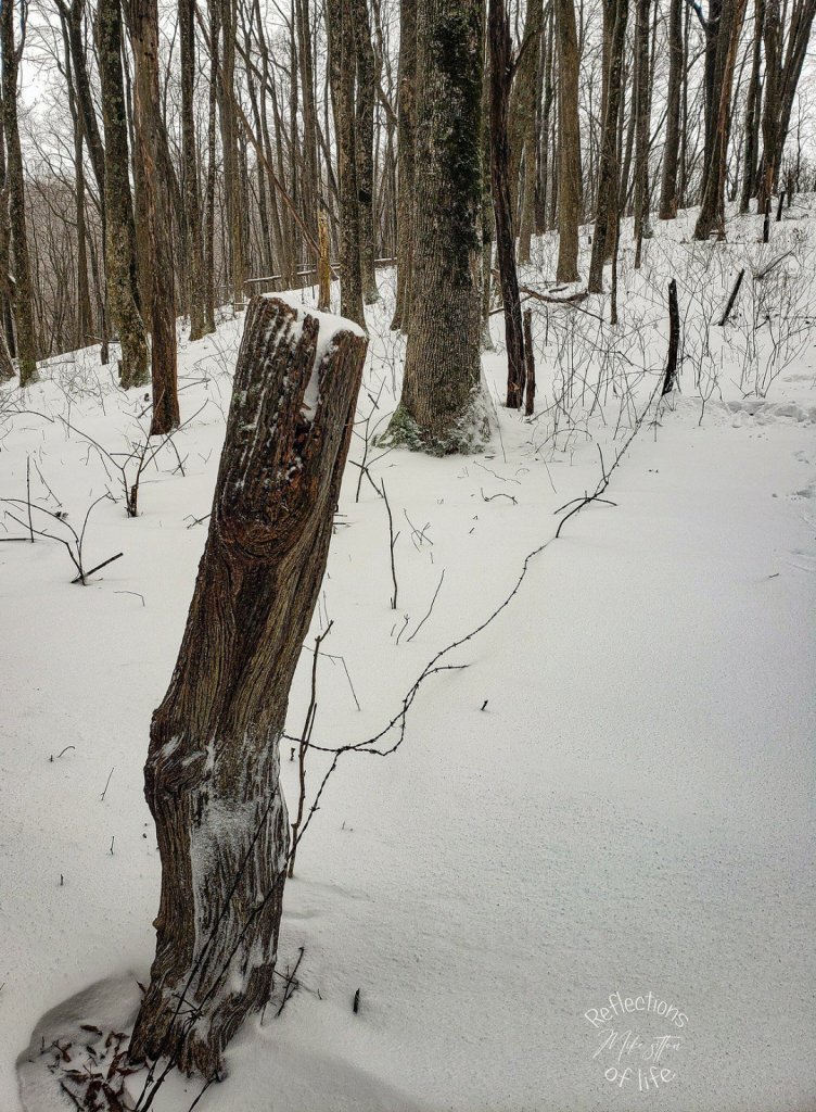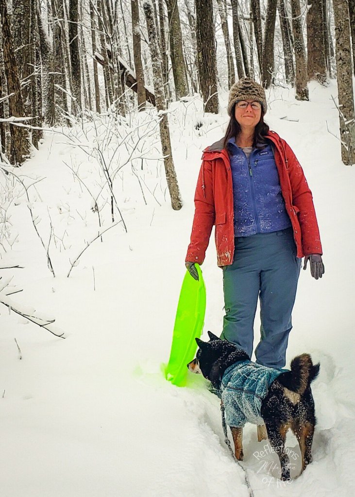 We love to bring sleds with us on our winter adventures in hopes that we will find a bald, a grassy field, any incline with few obstructions. However, it was not looking good for finding such areas today. Then it hit. This trail looks like a bobsled track. I took off my backpack and sat it on my lap. Then here comes that sentence, “Hey Emily videos this!” and off I go! But I soon realize holding on to the bag left me no hands to steer with, as I start into a spin. I hear Emily scream out as I leave the trail. This is where I remember there was a tree.