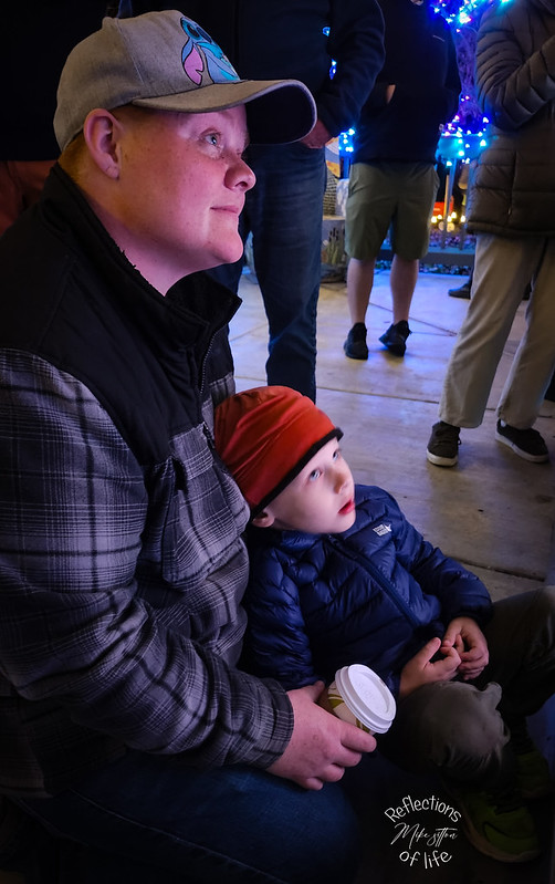 The weather was perfect, and the lights were gorgeous. We got marshmallows and made smores over a fire. Santa Claus manned the smores station. Wyatt told him he wanted a robot. This kid loves robots!!